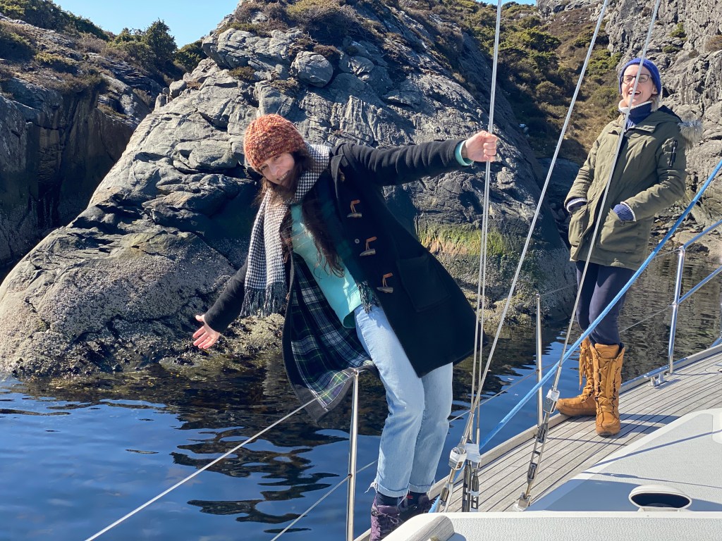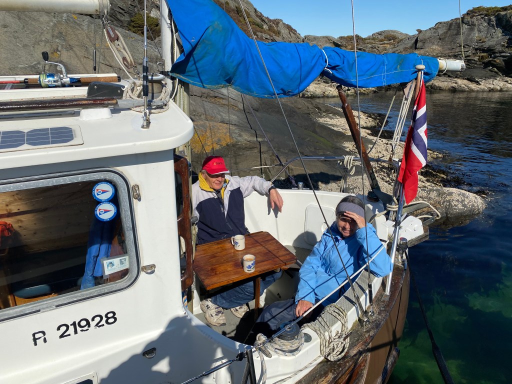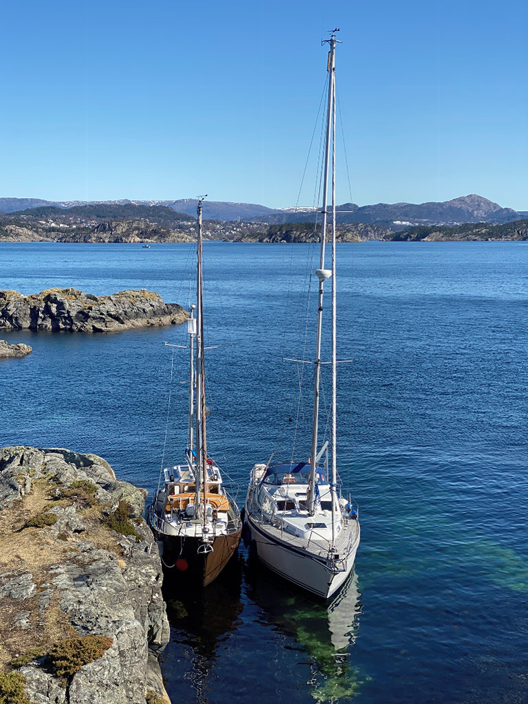 We arrived at Midtre Rotøyna at lunch time and could see Maja from a distance. It was low tide and it is rather hard to see the water depth from the steering wheel. Laila went in front, threw a line to Jeannette on Maja, and we fastened along side the ship which in turn was fastened to the rocks with two lines and nails prepared by Jens. There were not any waves except for the occasional passing fast boat, so mooring this way seemed to work out pretty nicely.